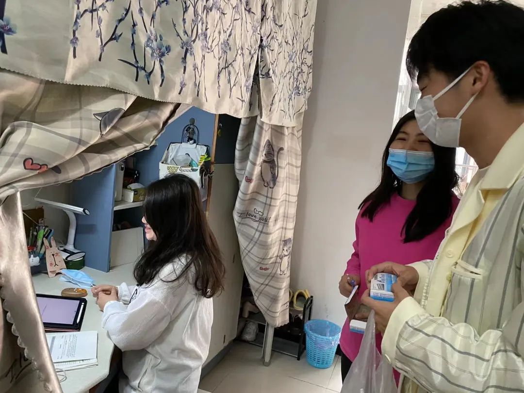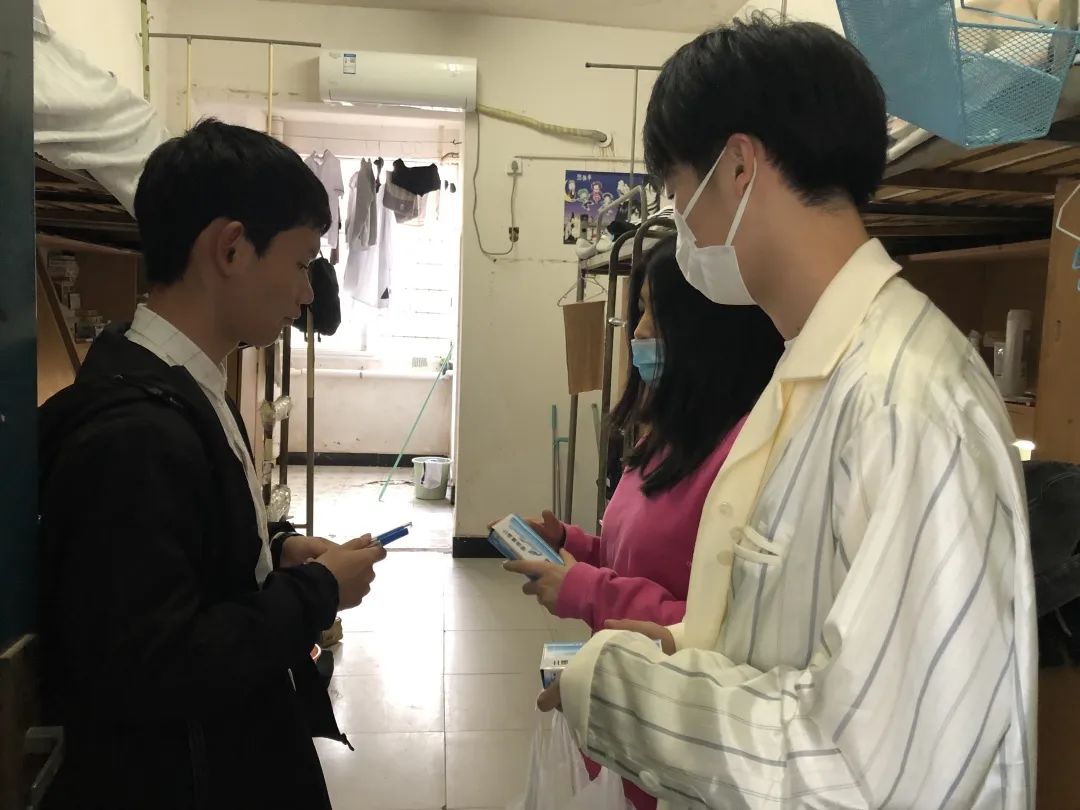 鉴于疫情防控的严峻形势,学校继续实施闭环管理,特殊时期,yl23455永利集团全体教师高度关注校内外研究生的身心健康、生活、学习状况,通过线上对校外研究生表达关心问候,深入宿舍了解在校研究生的防疫生活、学习环境。为强化在校研究生宿舍安全意识,营造文明、安全、健康、和谐的宿舍环境,4月6日下午,学院团委老师、研究生会成员进入研究生宿舍看望在校同学,巡查同学网课学习情况,并分发防疫用品,引导同学们进一步增强自我防护意识和保护能力,切实保障同学们的安全健康。
