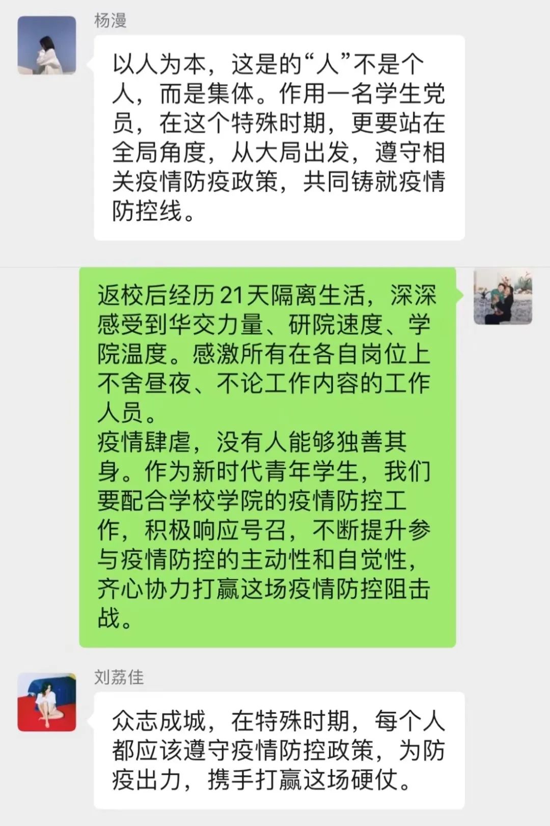 返校后经历21天隔离生活,深深感受到华交力量、研院速度、学院温度。感激所有在各自岗位上不舍昼夜、不论工作内容的工作人员。疫情肆虐,没有人能够独善其身。作为新时代青年学生,尤其是我们要配合学校学院的疫情防控工作,积极响应号召,不断提升参与疫情防控的主动性和自觉性,齐心协力打赢这场疫情防控阻击战。