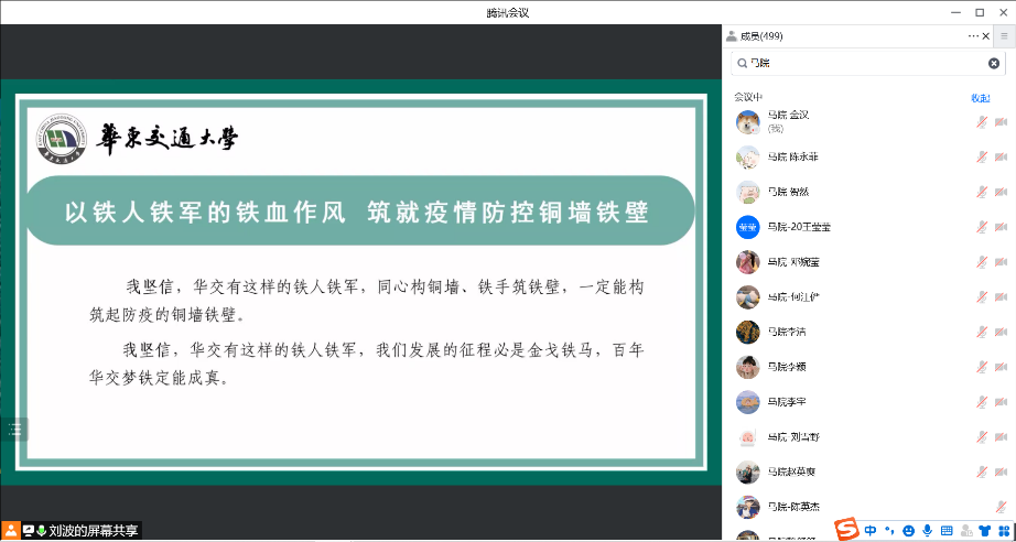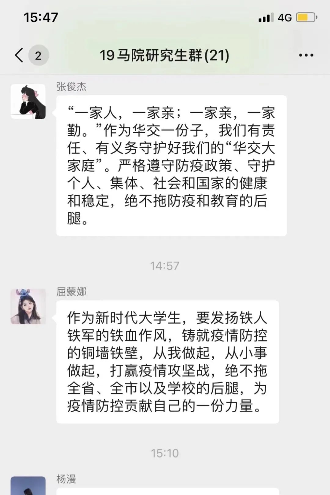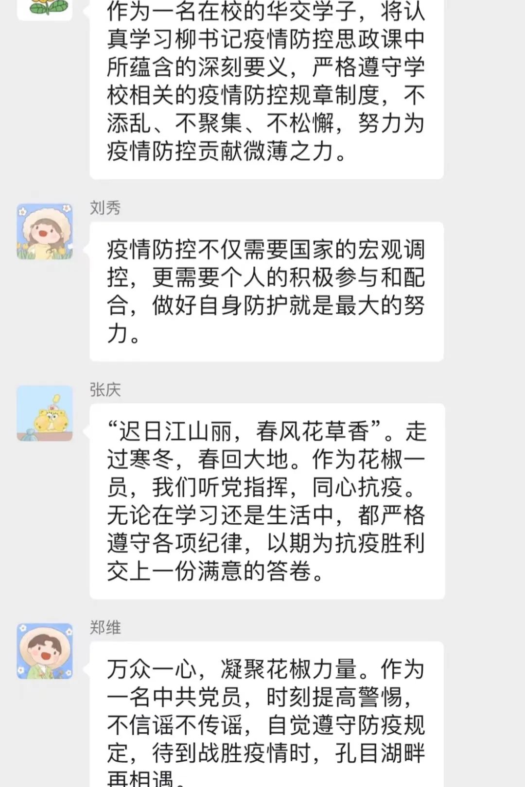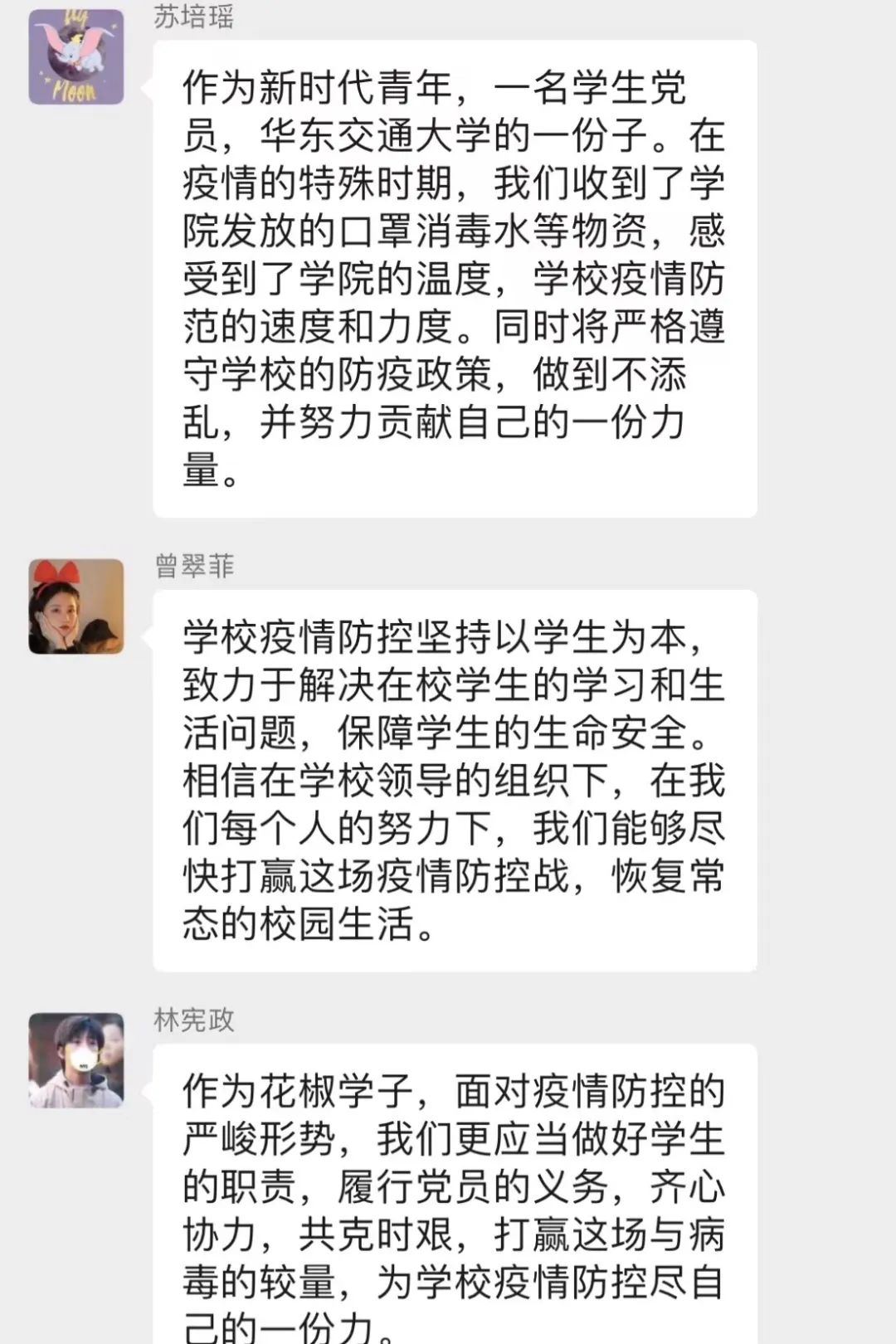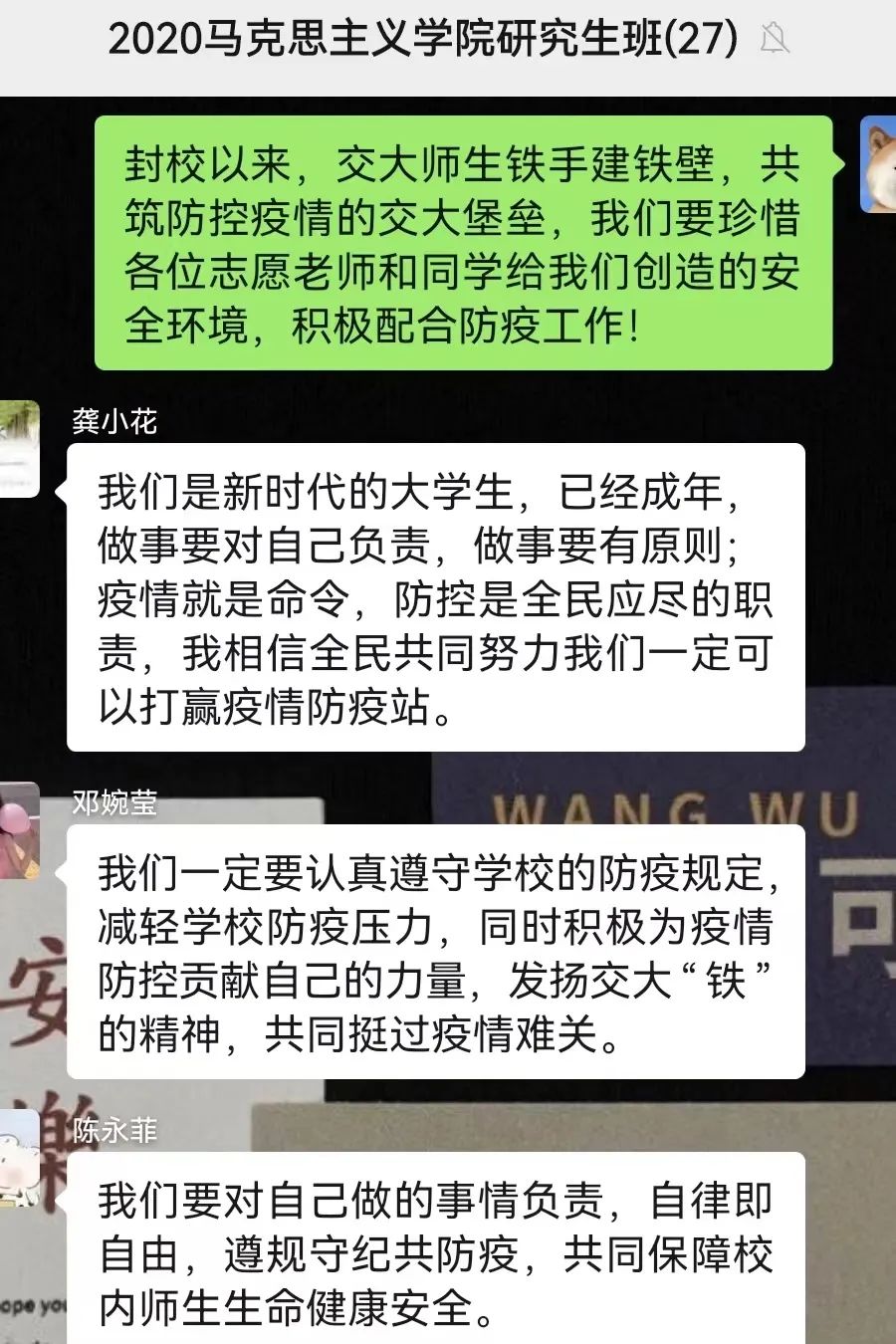 柳书记在疫情防控主题思政课上强调,作为yl23455永利集团的一份子,我们要发扬铁作风,打赢攻坚战。用自己的行动支持国内快速精准的“动态清零”政策,决不能有一丝松懈。现在校内的大好形势来之不易,是因为有幸有太多的华交铁人铁军在奋不顾身地蹚平一切困难。作为yl23455永利集团的研究生,我更应该主动承担防疫责任,发扬铁军风范,为打赢这场抗疫攻坚战贡献出自己的力量。