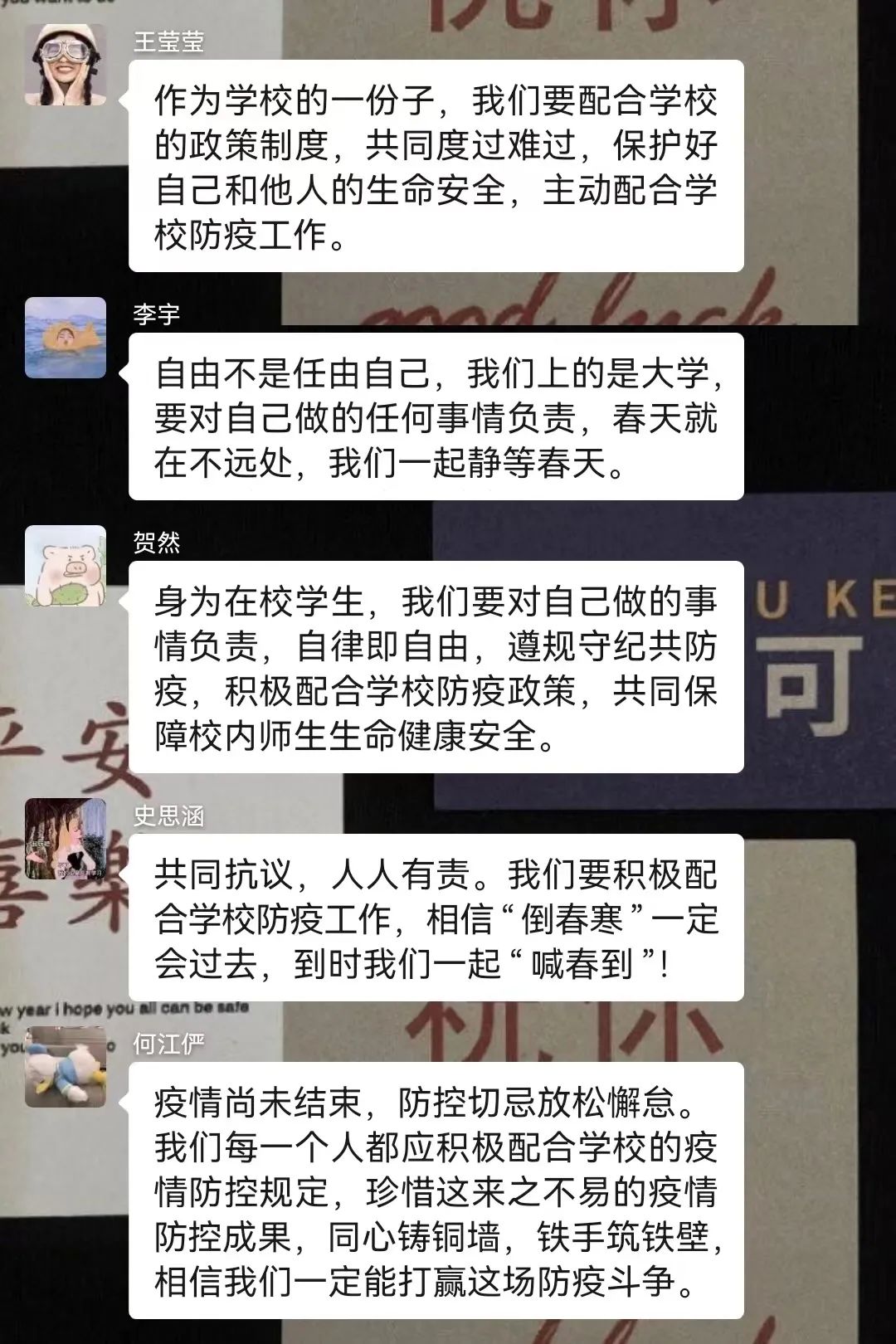 二、同学们继续在学业用力。毕业班同学,树立正确的就业观、择业观,实现顺利就业;非毕业班同学,请积极参与线上学习,上课期间不做与学习无关的事。