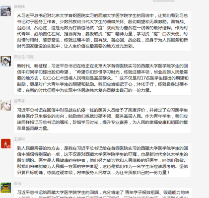 习近平总书记的回信,既体现了对于青年医务工作者的勉励对援藏精神、奉献精神的鼓励,也体现了对少数民族同胞人民的关心和友爱、对五十六个民族一家亲精神的贯彻。我们作为当代青年研究生,要深度学、贯彻习近平新时代中国特色社会主义思想和党的十九届四中全会精神。此次疫情中有很多医务工作者冲锋一线,这种大无畏的奉献精神值得每一位中国人学习,我们新时代青年人,更要认真学习,充实自己,有理想、有担当,团结友爱,为新中国的建设贡献自己的力量。