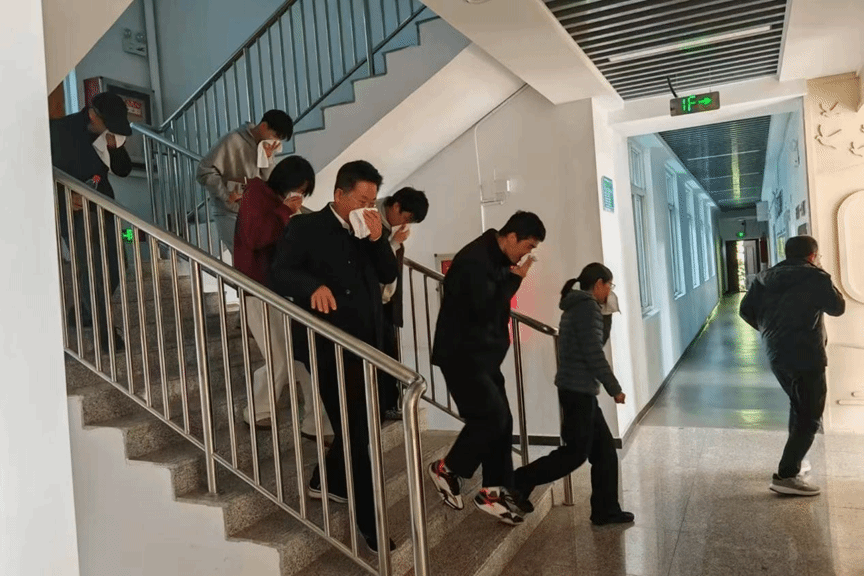 随着警报声响起,进入消防演练环节。由毛义鑫积极引导,分发毛巾和矿泉水,师生们迅速响应,按照事先规划的逃生路线,迅速而有序地撤离。疏散过程中师生们保持冷静,不恐慌,“弯腰、低头、捂口鼻”;整个过程师生们高筑生命“防火墙”,展现出了良好的应急反应能力。