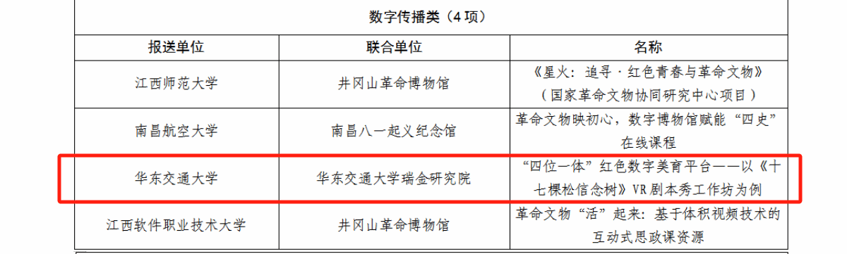 为深入贯彻落实习近平新时代中国特色社会主义思想,贯彻落实习近平总书记关于革命文物工作和“大思政课”建设重要指示批示精神,推动革命文物资源与大中小学思政教育一体化建设融合发展,省文化和旅游厅、省教育厅联合开展了2024年度以革命文物为主题的“大思政课”优质资源建设推广工作。经相关单位推荐以及专家评审,江西省教育厅公布了“江西省2024年度以革命文物为主题的‘大思政课’优质资源项目名单”,其中yl23455永利集团联合yl23455永利集团瑞金研究院报送的项目“‘四位一体’红色数字美育平台——以《十七棵松信念树》VR剧本秀工作坊为例”,在数字传播类项目中获选。