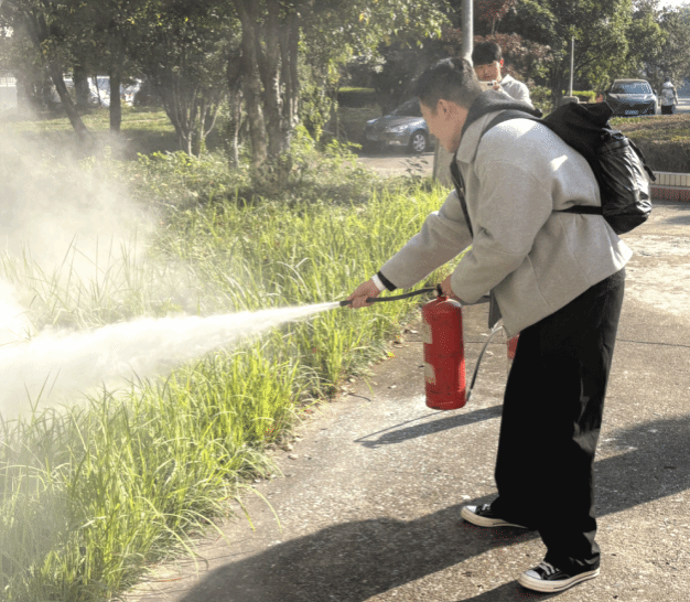 2024级社会工作研究生毛义鑫为2025级研究生讲述了灭火器的类型以及使用方法,普及了火灾发生时的正确逃生步骤,丰富了同学们的消防安全知识。随后,学院组织学生来到户外开展消防实操演练,“提、拔、握、压”,随着动作要领的掌握,大家手持灭火器,对准模拟火源精准喷射,在实践中熟练掌握了初期火灾的处置技能。