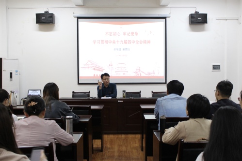 11月8日,我院召开了"不忘初心、牢记使命"主题教育专题学习会,学习贯彻党的十九届四中全会精神,学习会由党委委员、学院副院长张昭国主讲。