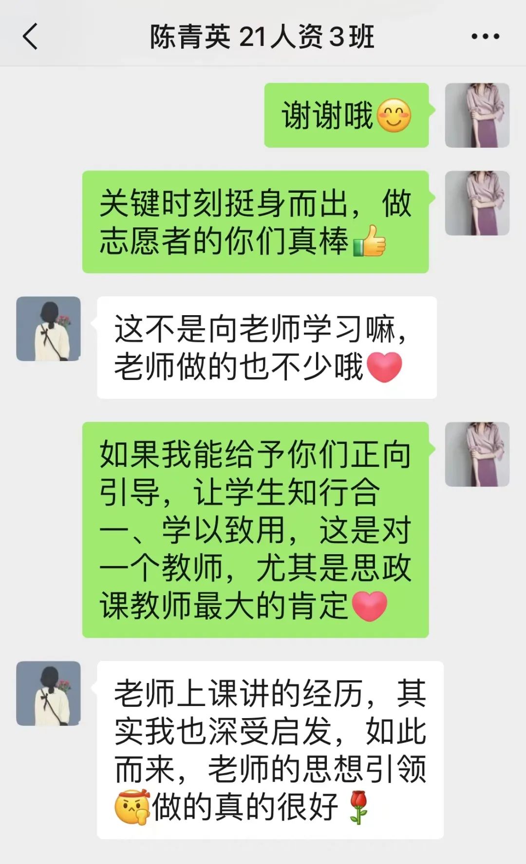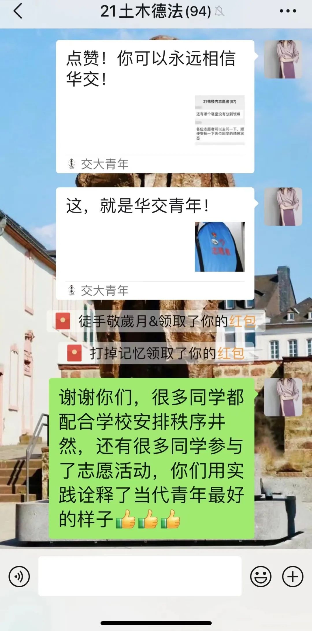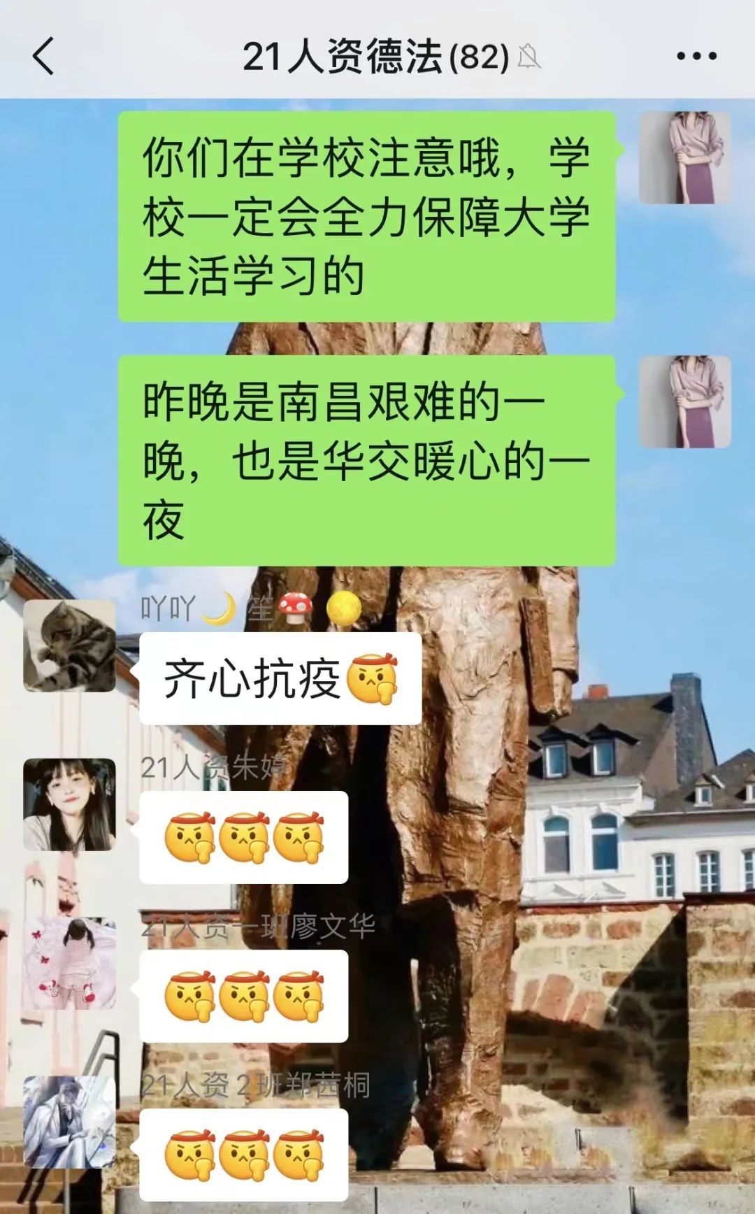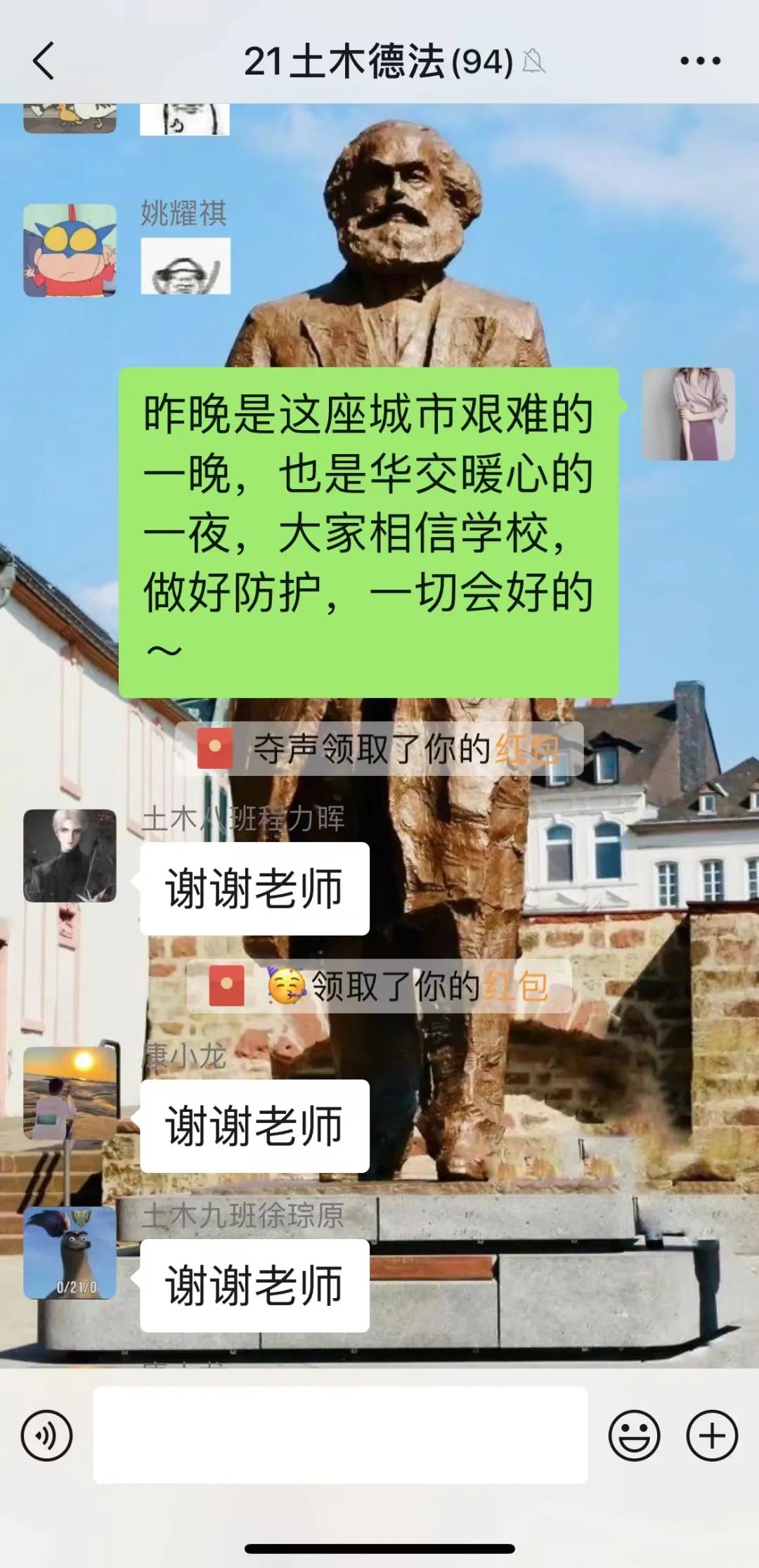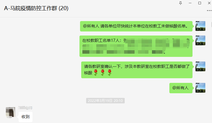 “昨晚是这座城市艰难的一晚,也是华交暖心的一夜,大家相信学校,做好防护,一切会好的。”这是3月18日许笑阳发在2个教学班级群中的一段话。学校进入封闭管理后,居家隔离的她第一时间在线上为同学们加油鼓劲。微信群里,一句句“稳住,我们能赢!”、一个个“奋斗”小表情汇聚成师生同心抗疫的坚强信心。