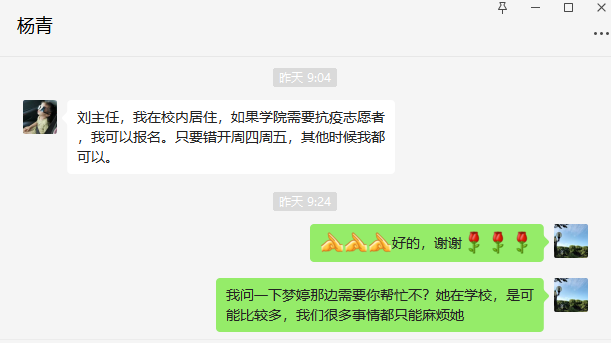 疫情防控关键时刻,杨青主动报名参加学院青年教师志愿服务活动,希望为在校师生做一点力所能及的事情。挨家挨户上门给在校教职工配送防疫物资,主动关心并想办法解决教职工燃眉之急。