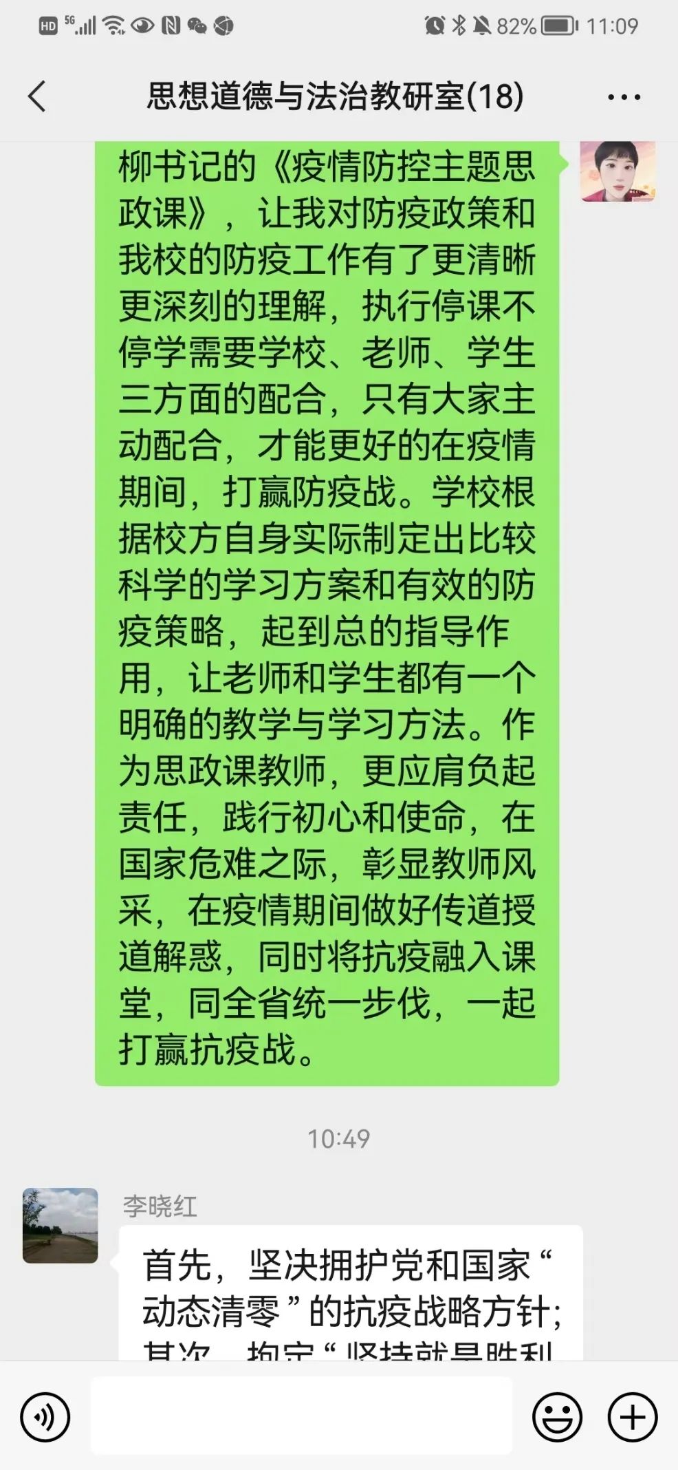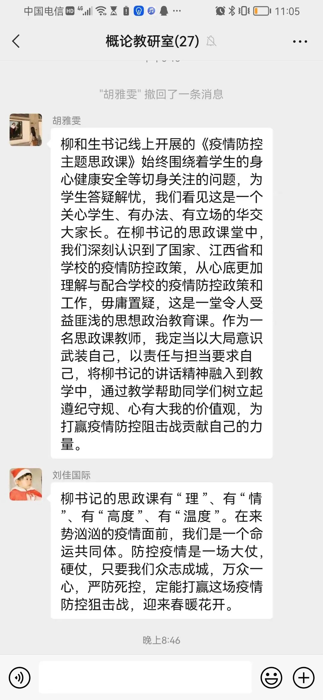 柳书记的这堂思政课不仅有数据和案例,而且用对比和标点侧重的方式把当前我国防疫政策的依据和我校的防疫对策、重点及违反防疫政策的后果讲得非常清晰、明白。作为思政课教师,我将在课堂中把我国的“动态清零”防疫政策和西方“躺平”政策结果进行对比,凸显中国共产党“以人民为中心”的执政理念,同时也可以用华交师生共同战疫的案例来说明“中国梦”的实现需要凝聚中国力量,为取得抗疫胜利贡献自己的力量。
