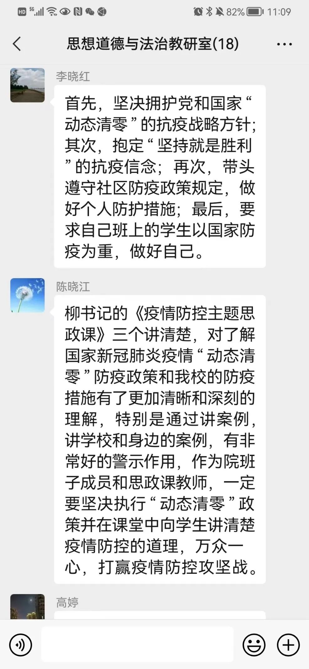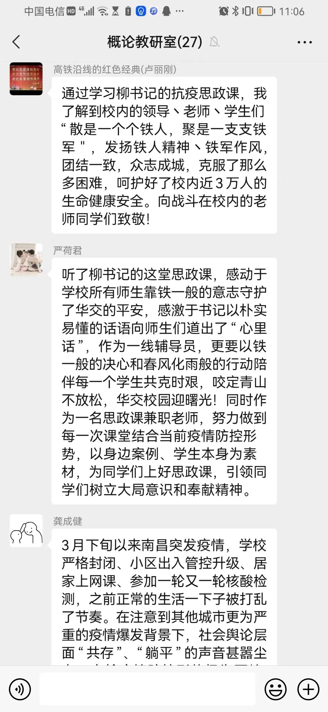 观看“疫情防控主题思政课”后,各教研室结合主题开展了热烈的研讨交流,教师们纷纷表示,柳和生书记所授的“疫情防控主题思政课”用数据讲清依据,用对比讲清对策,用标点讲清重点,通过学习,我们对目前疫情防控形势有了更精准的把握,对学校疫情防控政策有了更全面的理解,也让我们感受到了正坚守在防疫一线的同事、同学那种坚不可摧,勇于担当的精神。作为交大人,我们要弘扬“铁”精神,发扬“铁”的作风,从严要求自身,自觉遵守校党委提出的各项疫情防控要求,做疫情防控的参与者和责任者;作为思政课教师,我们要用情用心上好战“疫”这堂思政大课,以疫情防控的鲜活实践教育引导青年大学生深刻认识中国共产党坚持“人民至上、生命至上”的防控理念,使广大学子牢记“国之大者”,把爱国爱家爱校作为最大的责任担当,激发他们同心抗疫的强大内驱力。