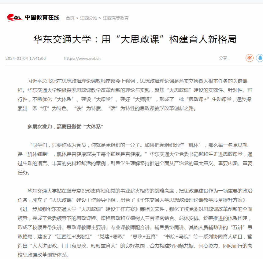 yl23455永利集团站在坚守意识形态阵地和党的事业薪火相传的战略高度,把思政课建设作为一项重要的政治任务,成立了“大思政课”建设工作领导小组,出台了《yl23455永利集团思想政治理论课教学质量提升方案》《进一步加强yl23455永利集团“大思政课”建设工作方案》等相关文件,强化了校党委对思政课改革创新的全面领导,完成了党委领导下的思政课程、课程思政和立德树人三者紧密结合、总体安排、统筹推进的体系构建,形成了校领导带头讲、思政课教师主要讲、专业课教师配合讲、辅导员协同讲、其他人员辅助讲的“五讲”思政格局,建设了“江西红+铁路红”“党建+思政”“思政+五育”“书院+马院”等一系列协同育人项目,营造出“人人讲思政、门门有思政、时时重育人”的良好氛围,合力构建好同频共振、同心协力、同向而行的高校思政课改革创新体系。