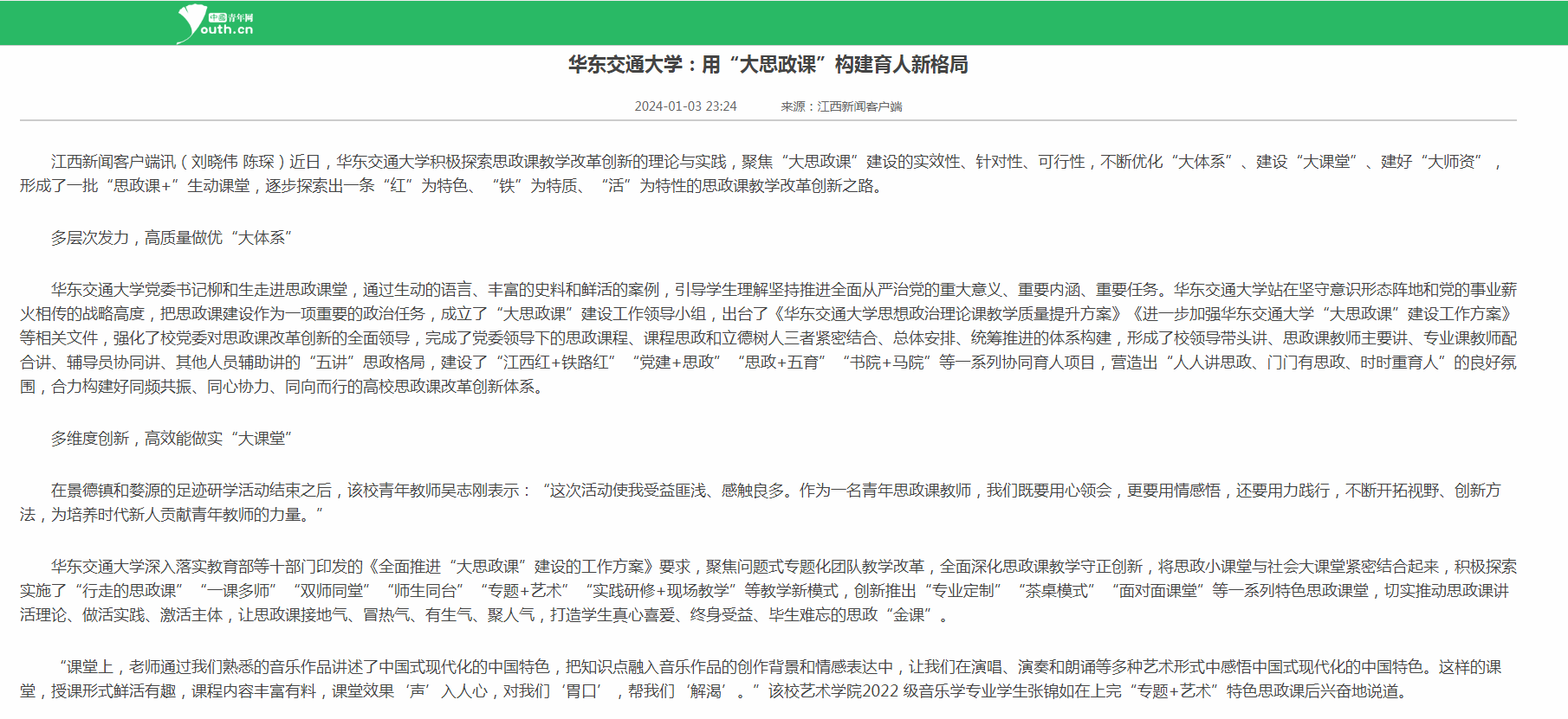 yl23455永利集团站在坚守意识形态阵地和党的事业薪火相传的战略高度,把思政课建设作为一项重要的政治任务,成立了“大思政课”建设工作领导小组,出台了《yl23455永利集团思想政治理论课教学质量提升方案》《进一步加强yl23455永利集团“大思政课”建设工作方案》等相关文件,强化了校党委对思政课改革创新的全面领导,完成了党委领导下的思政课程、课程思政和立德树人三者紧密结合、总体安排、统筹推进的体系构建,形成了校领导带头讲、思政课教师主要讲、专业课教师配合讲、辅导员协同讲、其他人员辅助讲的“五讲”思政格局,建设了“江西红+铁路红”“党建+思政”“思政+五育”“书院+马院”等一系列协同育人项目,营造出“人人讲思政、门门有思政、时时重育人”的良好氛围,合力构建好同频共振、同心协力、同向而行的高校思政课改革创新体系。