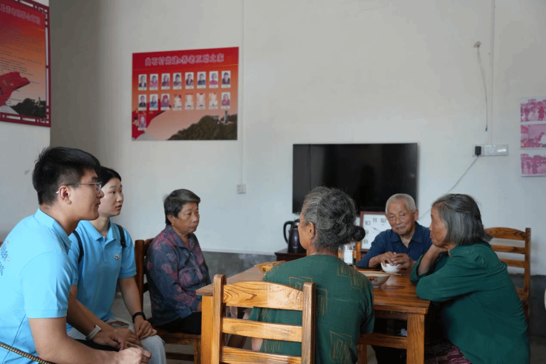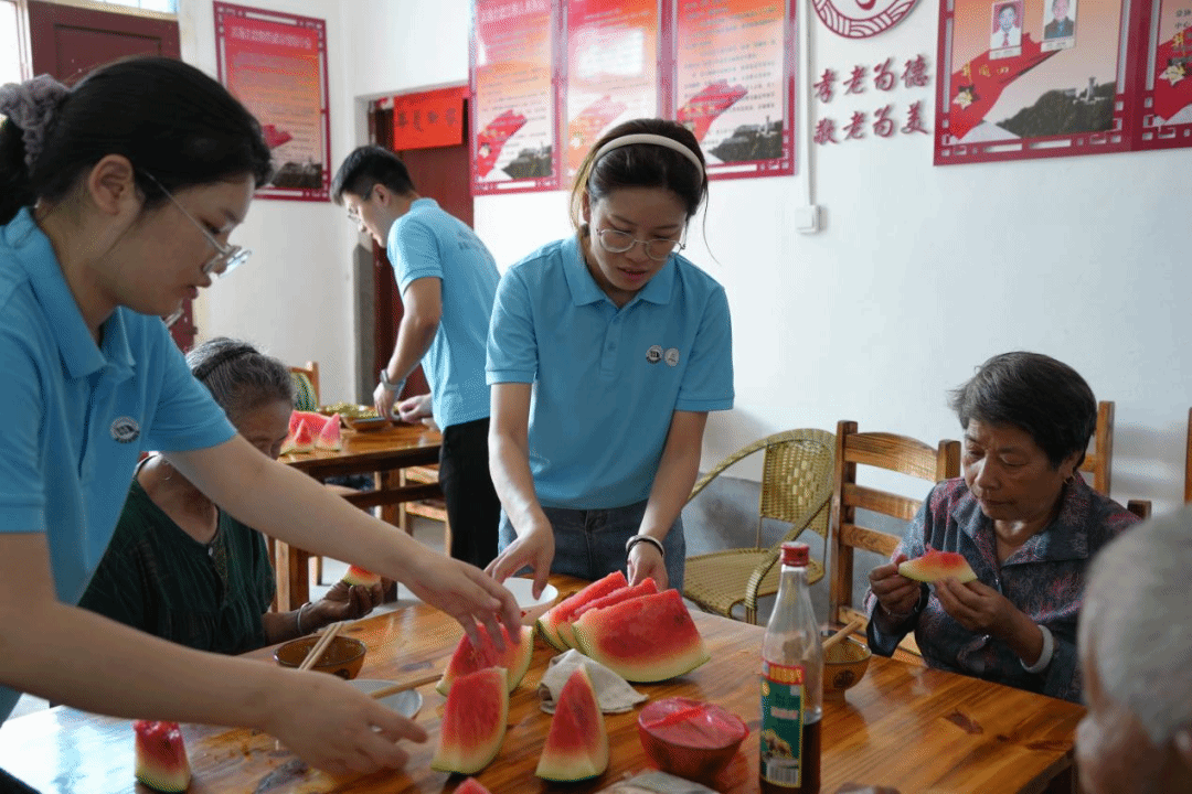 午餐后,研究生们与老人们围坐成群,边吃西瓜边聊天。老人们分享了他们的人生经历,讲述了在艰苦的条件下如何通过劳动创造美好生活。研究生们认真聆听,不时提问,与老人们深入交流。