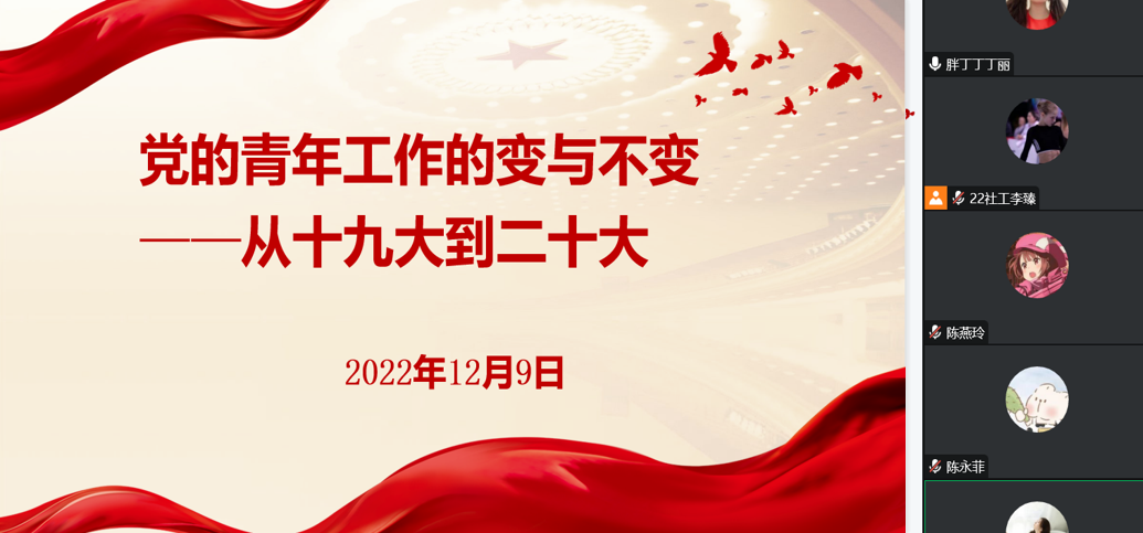 为进一步营造学习宣传贯彻党的二十大精神的浓厚范围,以实际行动推动党的二十大精神落实见效。12月9日晚,yl23455永利集团线上开展党的二十大精神学习宣讲,由院团委书记丁丽领学,学院全体团干部参加。