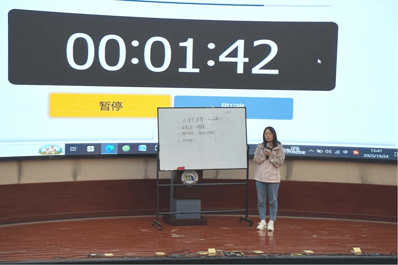 第三届思政课教学展示活动获奖者徐帅老师以《精诚所至,金石为开》为主题,从认知、准备、心得三方面分享赛事经验,并现场播放特等奖八分钟讲课视频。他强调“细节制胜”,从方案打磨、素材筛选到模拟演练,每一步都需反复推敲,确保呈现最佳效果。