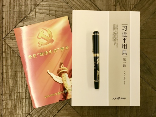 随后张剑锋书记为每位过政治生日的党员颁发生日礼物:一张亲笔签名的生日贺卡,一本《习近平用典》和一支钢笔。