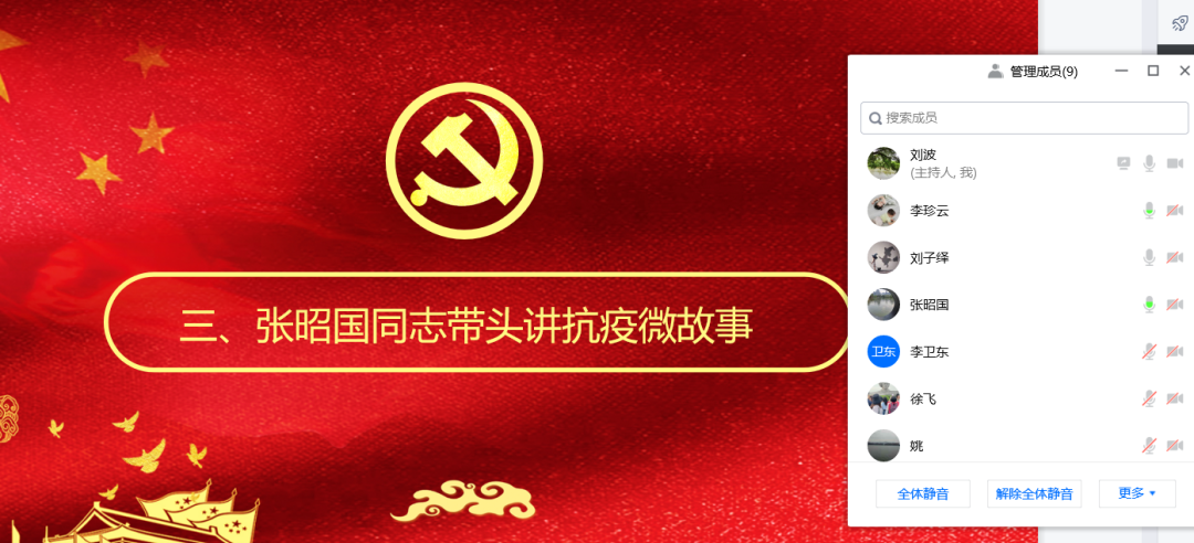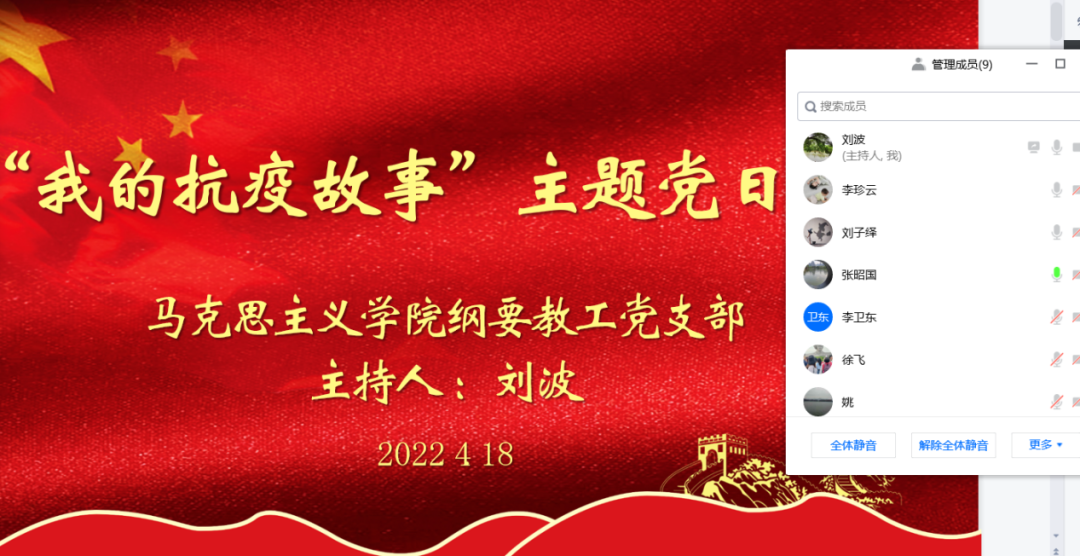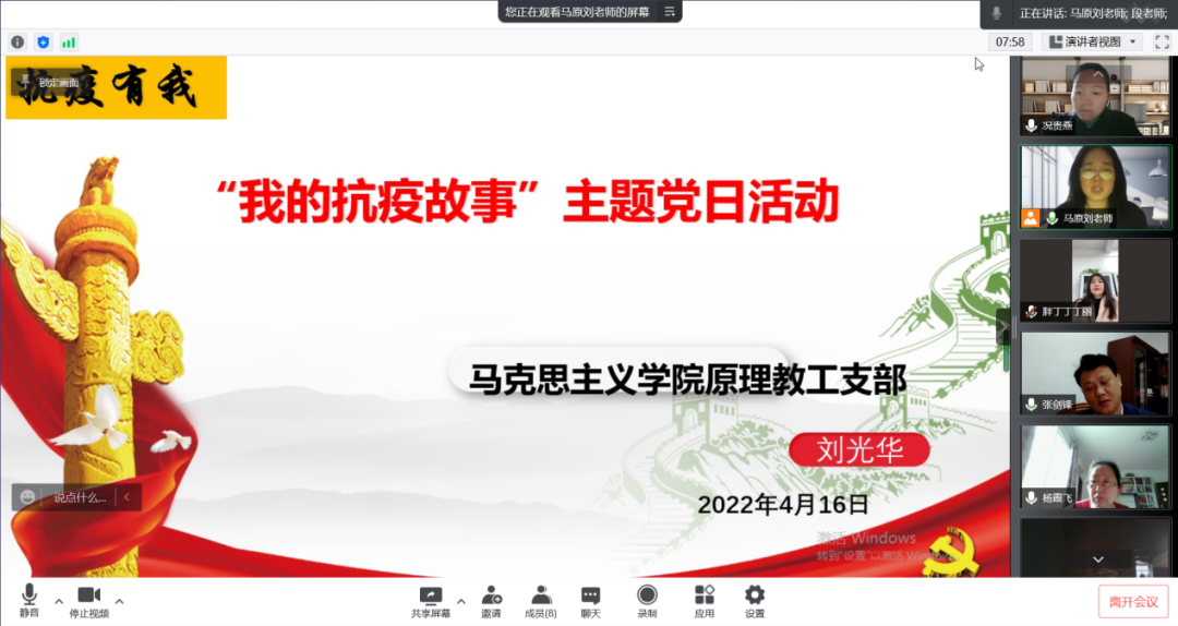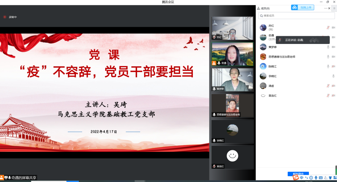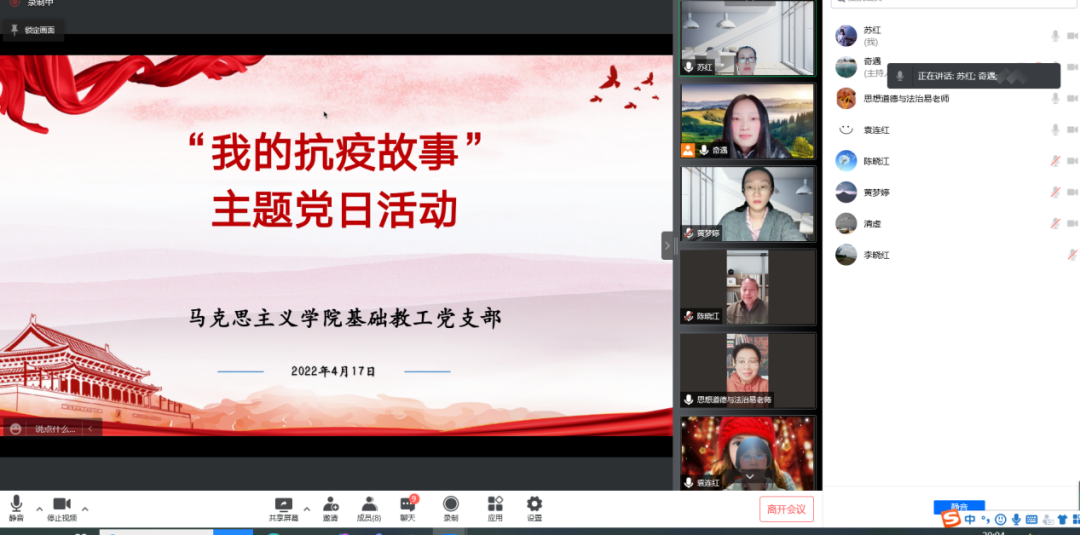 在“我的抗疫故事”分享会上,每位党员都从不同的角度、不同的岗位、不同的身份讲述着自己平凡或不平凡的抗疫故事。校外的老师有的居家做好线上教学工作,及时将“抗疫精神”融入思政课堂;有的加入社区志愿者服务工作;有的持家有方积极主动带领家人配合政府、社区做好各项防疫工作;校内的师生则各司其职,坚守岗位,认真学习。在上好网课的同时,有的加入学校、学院志愿者服务队,参加核酸检测、楼道清理、配送防疫物资等服务工作组;有的认真遵守校园各项防疫规定,做好个人防护,不乱跑不添乱;有的认真做好本职工作,努力维护学校、学院的各项工作稳步前进。不论身处何地何职,每位党员都在这场疫情防控攻坚战中贡献着自己的力量。