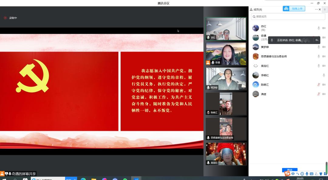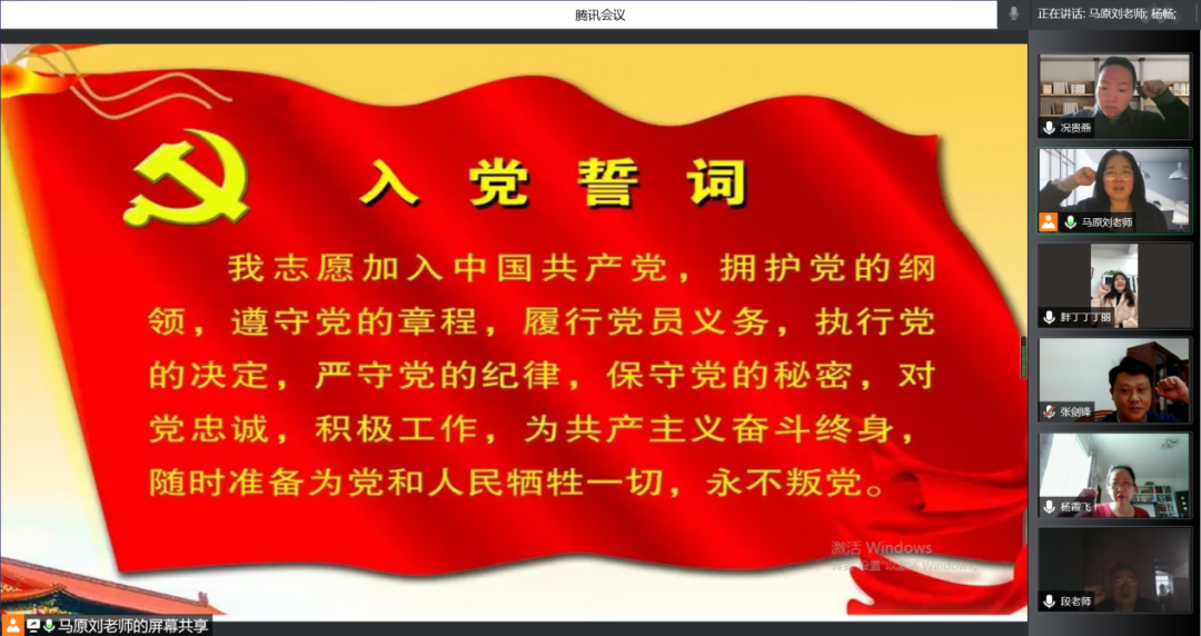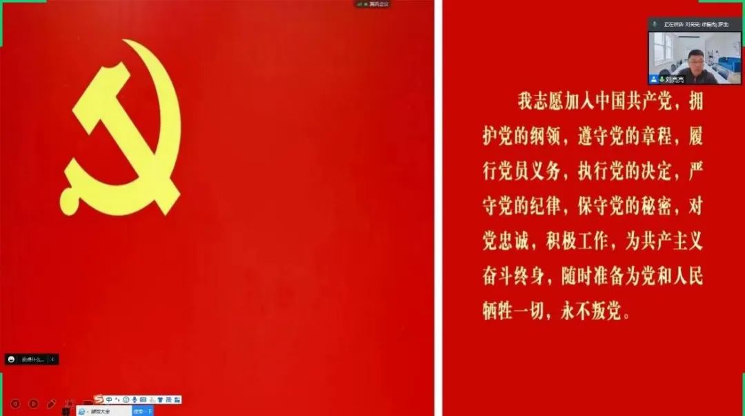 本次党日活动中的重温入党誓词和党员同志讲述抗“疫”故事让我心有所触。受疫情影响,这是第一次在线上宣誓,但我仍为之感到振奋,因为入党誓词是共产党员用生命和热血呐喊出的誓言,尤其是面对疫情来势汹汹的状态下,全国9500多万共产党员为抗击疫情冲锋陷阵,义无反顾!从同志们分享的抗“疫”故事中也让我认识到,不论是在校外还是校内,学生党员都应该发挥先锋模范作用,用自己的所思所想所学为抗疫作贡献、树旗帜。