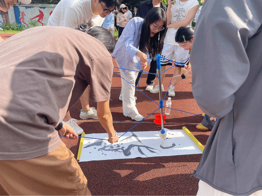 在“神笔马良”项目中,所有队员拉绳子的末端,在不接触毛笔的情况下,拉动大毛笔在纸上齐心协力地写下“我爱华交”四个字。