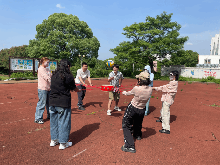 在“同心协力”项目中,大家紧握手中的绳索,齐声高喊口号,排球在鼓面上有规律地跳动着,“一、二,一、二……” 队员们的口号声坚定而有力。